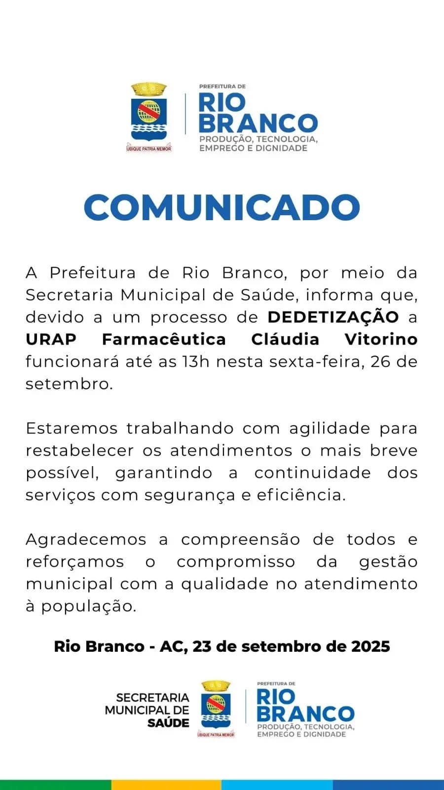 A Prefeitura de Rio Branco informou que os atendimentos serão normalizados assim que o procedimento de dedetização for concluído e agradeceu a compreensão de todos os usuários da URAP Cláudia Vitorino. A ação visa garantir um ambiente seguro e adequado para pacientes e funcionários.