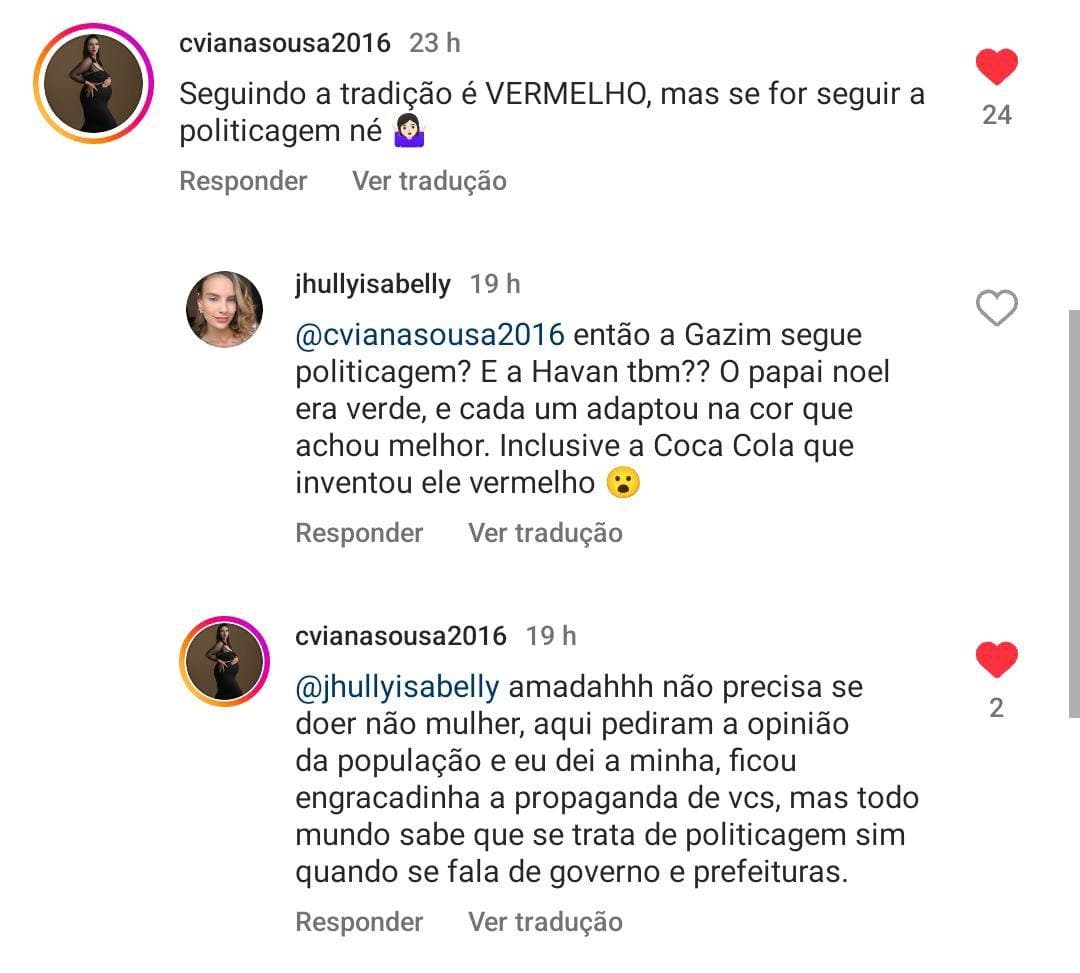 “Seguindo a tradição é vermelho, mas se for seguir a politicagem, ne?”, comentou uma internauta. O comentário não foi bem visto pela garota propaganda do prefeito, Jhully Isabelly, que fez questão de sair em defesa do gestor “então a Gazim segue politicagem? E a Havan tbm?? O papai noel era verde, e cada um adaptou na cor que achou melhor. Inclusive a Coca Cola que inventou ele vermelho”, defendeu.