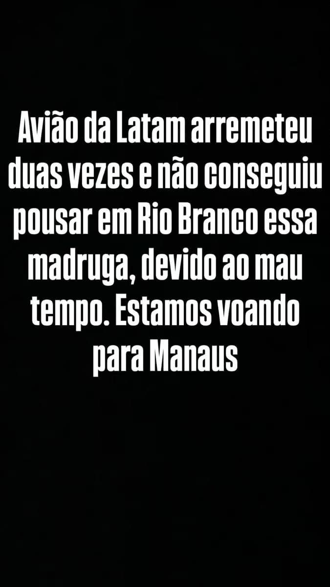 Um avião da Latam Linhas Aéreas, que seguia de Brasília para Rio Branco, teve que alterar sua rota e pousar em Manaus na madrugada desta sexta-feira (7) devido a condições climáticas adversas no aeroporto da capital acreana. A informação foi confirmada pelo deputado federal Roberto Duarte (Republicanos) em suas redes sociais.
