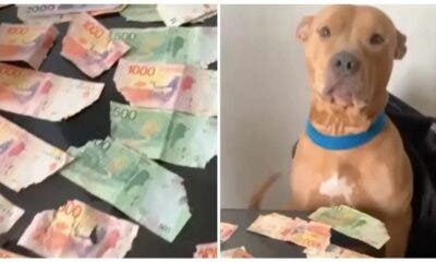 Uma cadela pitbull chamada Indica, que vive na Argentina com seu tutor, mastigou e engoliu pedaços de cédulas no valor total de R$ 974 (56 mil...
