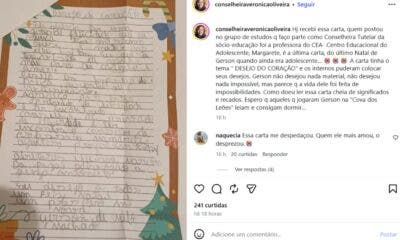 A conselheira tutelar da socioeducação, Verônica Oliveira, compartilhou, na última terça-feira, 16, uma carta de Natal escrita por Gerson de Melo Machado, o jovem que foi...