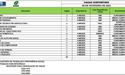 O Sistema Nacional de Emprego do Acre (Sine), está ofertando 23 vagas de emprego para esta quarta-feira, 8. Dessas, 13 são para quem possui nível fundamental,...