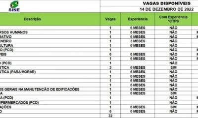 O Sistema Nacional de Emprego do Acre (Sine), está ofertando, nesta quarta-feira, 14, 32 vagas de emprego. Para concorrer a uma das vagas, caso a pessoa...