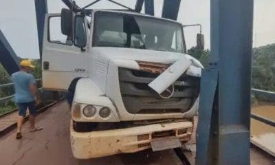 Um caminhão tanquer se chocou contra uma das colunas da ponte metálica José Augusto, único meio de ligação entre dois municípios da fronteira (Brasiléia/Epitaciolândia), por volta...
