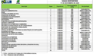 O Sistema Nacional de Emprego do Acre (Sine), está ofertando, nesta sexta-feira, 11, em Rio Branco (AC), 63 vagas de emprego. Dessas, 30 vagas são para...
